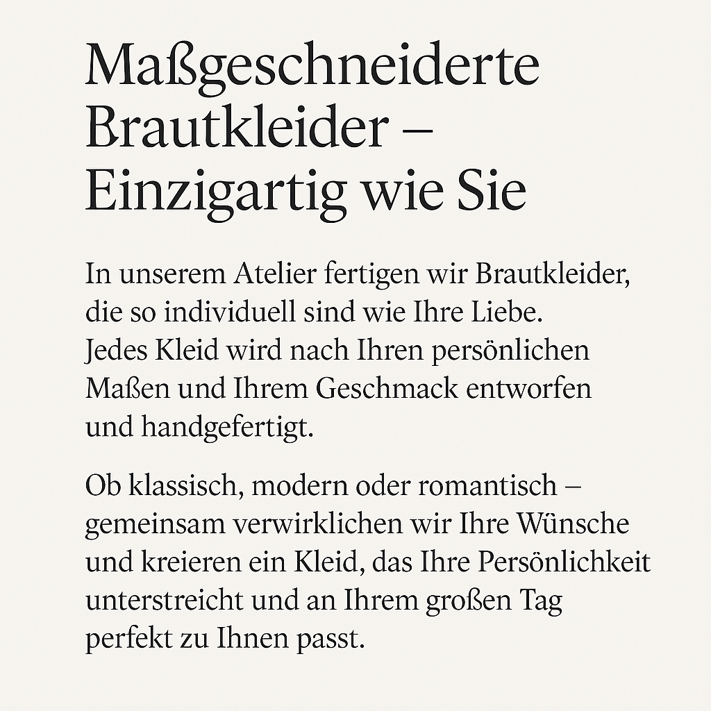 Ein zeitlos elegantes Brautkleid, das Ihre Schönheit an Ihrem großen Tag perfekt unterstreicht. Das Modell begeistert durch seine hochwertige Verarbeitung, edle Materialien und eine schmeichelhafte Passform. Unsere Brautkleider werden ausschließlich als Maßanfertigung hergestellt – so sitzt Ihr Kleid wie eine zweite Haut und spiegelt Ihre Persönlichkeit wider. Erhältlich in den Größen 34 bis 60, sodass jede Braut ihr Traumkleid findet. Mit diesem Modell setzen Sie auf Exklusivität, Eleganz und höchsten Tragekomfort – für einen unvergesslichen Auftritt am Hochzeitstag. Nach Angabe Ihrer Maße beträgt die Lieferzeit ca. 6–8 Wochen. Preis je nach Größe Gr. 34 bis 38 2500 € Gr. 40 bis 42 2700€ Gr. 44 bis 48 2800 € Gr. 50 bis 54 3100 € Gr. 56 bis 60 3300 €