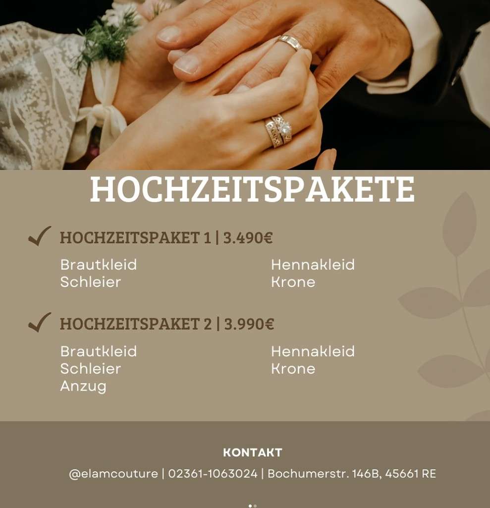 Ein zeitlos elegantes Brautkleid, das Ihre Schönheit an Ihrem großen Tag perfekt unterstreicht. Das Modell begeistert durch seine hochwertige Verarbeitung, edle Materialien und eine schmeichelhafte Passform. Unsere Brautkleider werden ausschließlich als Maßanfertigung hergestellt – so sitzt Ihr Kleid wie eine zweite Haut und spiegelt Ihre Persönlichkeit wider. Erhältlich in den Größen 34 bis 60, sodass jede Braut ihr Traumkleid findet. Mit diesem Modell setzen Sie auf Exklusivität, Eleganz und höchsten Tragekomfort – für einen unvergesslichen Auftritt am Hochzeitstag. Nach Angabe Ihrer Maße beträgt die Lieferzeit ca. 6–8 Wochen. Preis je nach Größe Gr. 34 bis 38 2500 € Gr. 40 bis 42 2700€ Gr. 44 bis 48 2800 € Gr. 50 bis 54 3100 € Gr. 56 bis 60 3300 €